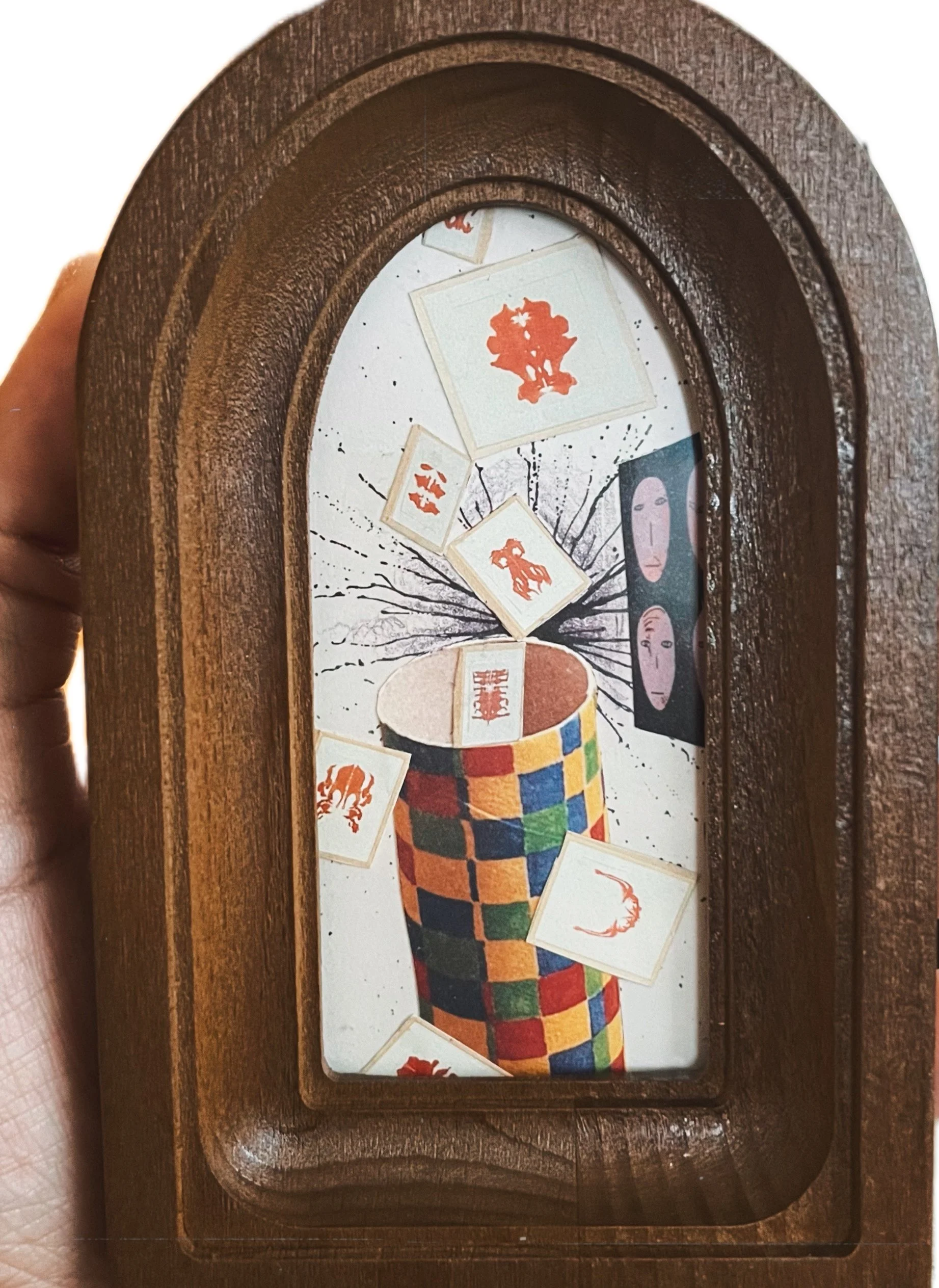 multimedia illustrative collage & watercolor pencil on handmade watercolor paper. archway frame from universalhappygift on Etsy. 5 in. X 3 in.