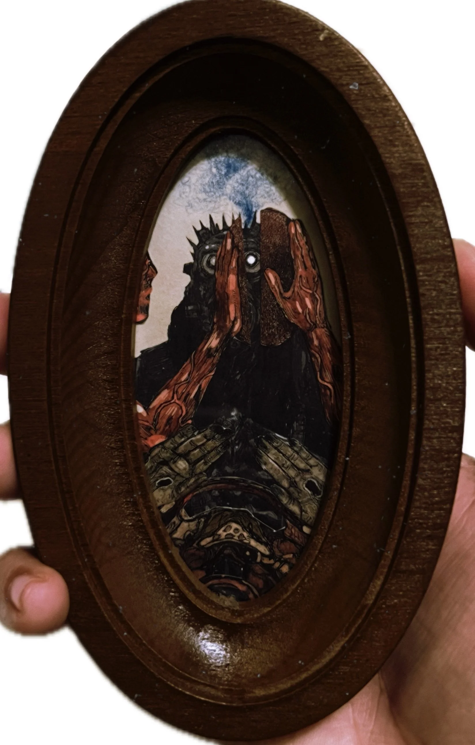 multimedia illustrative collage detailed with oil-based ink and watercolor pencils on recycled DOROHEDORO pages. oval frame from universalhappygift on Etsy. 5 in. X 3 in.