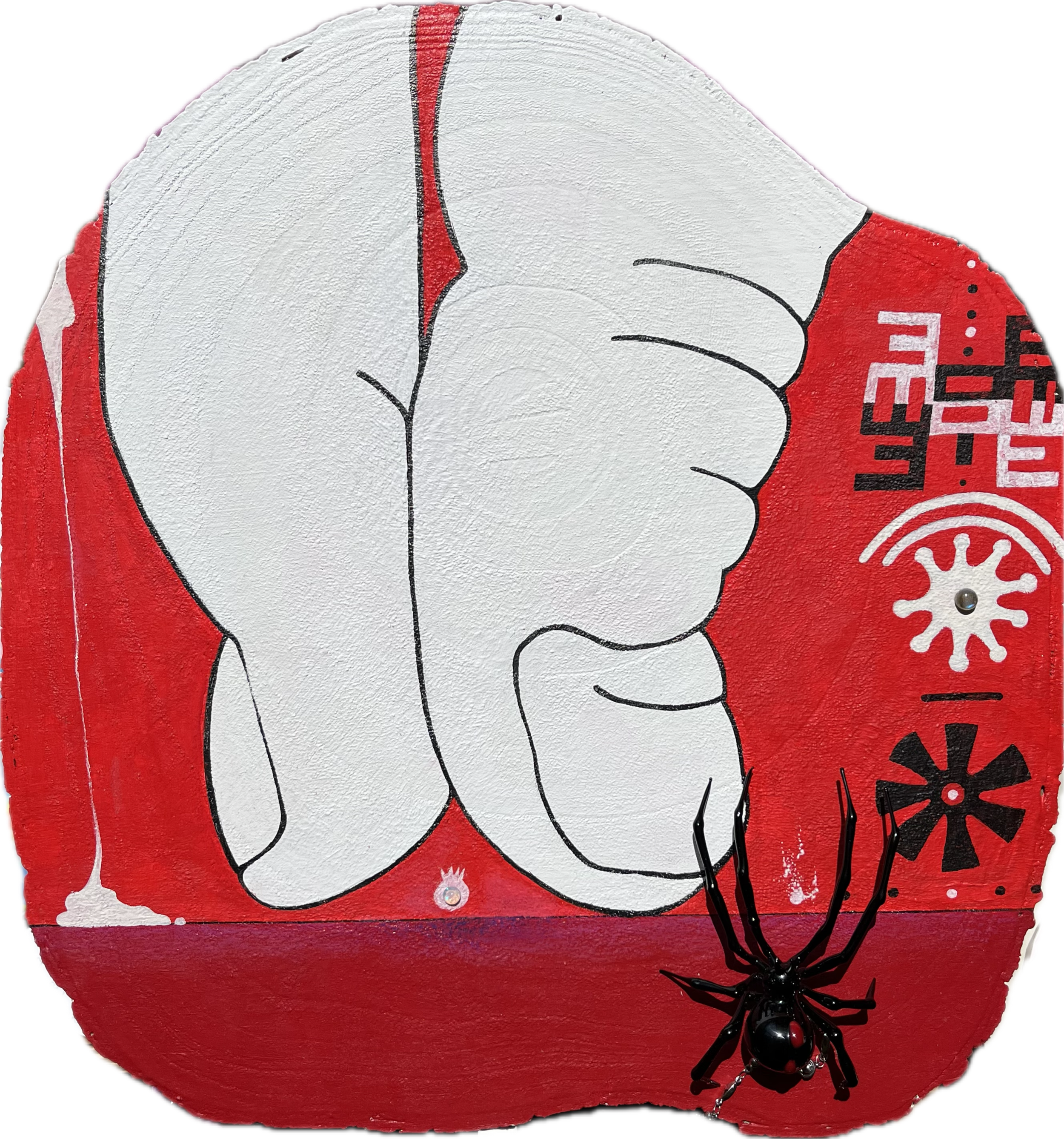 Acrylic, gouache, oil-based ink and watercolor pencils on paulownia wood. Ethiopian opal and labradorite cabochons sourced from India via Etsy, spider hanging from Kyiv, Ukraine. 13.5 in. X 11.5 in.